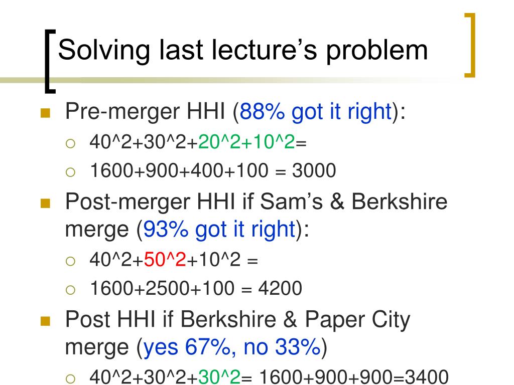Solving last lecture’s problem • Pre-merger HHI (88% got it right): • 40^2+30^2+20^2+10^2= • 1600+900+400+100 = 3000 • Post-merger HHI if Sam’s & Berkshire merge (93% got it right): • 40^2+50^2+10^2 = • 1600+2500+100 = 4200 • Post HHI if Berkshire & Paper City merge (yes 67%, no 33%) • 40^2+30^2+30^2= 1600+900+900=3400