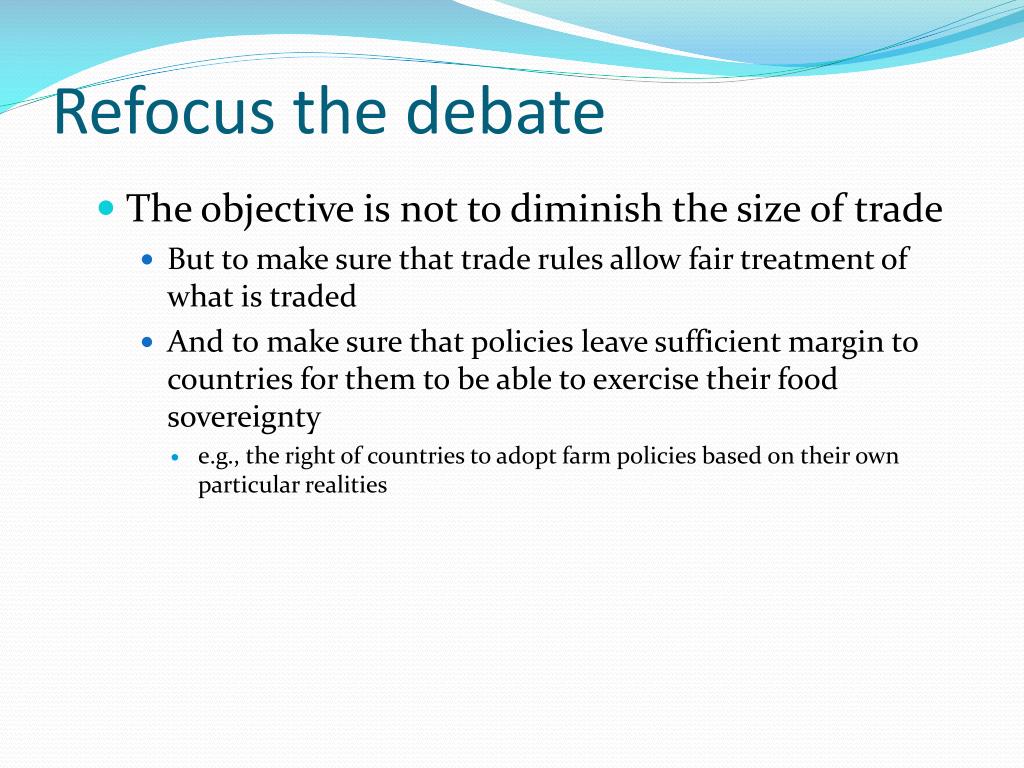 Refocus the debate • The objective is not to diminish the size of trade • But to make sure that trade rules allow fair treatment of what is traded • And to make sure that policies leave sufficient margin to countries for them to be able to exercise their food sovereignty • e.g., the right of countries to adopt farm policies based on their own particular realities