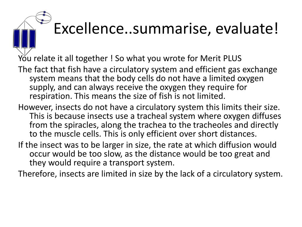 Excellence..summarise, evaluate! You relate it all together ! So what you wrote for Merit PLUS The fact that fish have a circulatory system and efficient gas exchange system means that the body cells do not have a limited oxygen supply, and can always receive the oxygen they require for respiration. This means the size of fish is not limited. However, insects do not have a circulatory system this limits their size. This is because insects use a tracheal system where oxygen diffuses from the spiracles, along the trachea to the tracheoles and directly to the muscle cells. This is only efficient over short distances. If the insect was to be larger in size, the rate at which diffusion would occur would be too slow, as the distance would be too great and they would require a transport system. Therefore, insects are limited in size by the lack of a circulatory system.