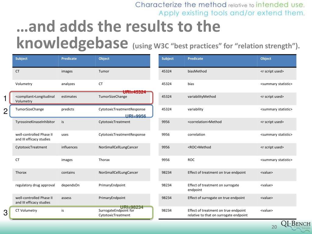 …and adds the results to the knowledgebase (using W3C “best practices” for “relation strength”). URI=45324 1 2 URI=9956 URI=98234 3 20