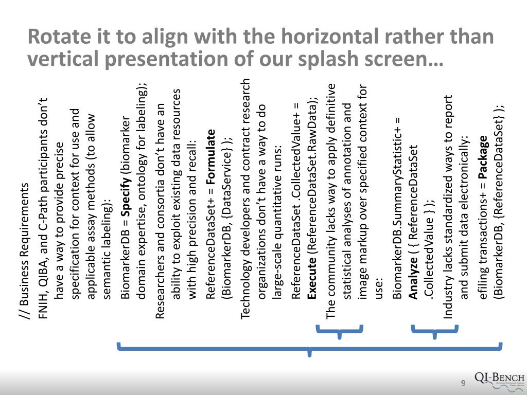 Rotate it to align with the horizontal rather than vertical presentation of our splash screen… // Business Requirements FNIH, QIBA, and C-Path participants don’t have a way to provide precise specification for context for use and applicable assay methods (to allow semantic labeling): BiomarkerDB = Specify (biomarker domain expertise, ontology for labeling); Researchers and consortia don’t have an ability to exploit existing data resources with high precision and recall: ReferenceDataSet+ = Formulate (BiomarkerDB, {DataService} ); Technology developers and contract research organizations don’t have a way to do large-scale quantitative runs: ReferenceDataSet .CollectedValue+ = Execute (ReferenceDataSet.RawData); The community lacks way to apply definitive statistical analyses of annotation and image markup over specified context for use: BiomarkerDB.SummaryStatistic+ = Analyze ( { ReferenceDataSet .CollectedValue } ); Industry lacks standardized ways to report and submit data electronically: efiling transactions+ = Package (BiomarkerDB, {ReferenceDataSet} ); 9 9 9 9 9