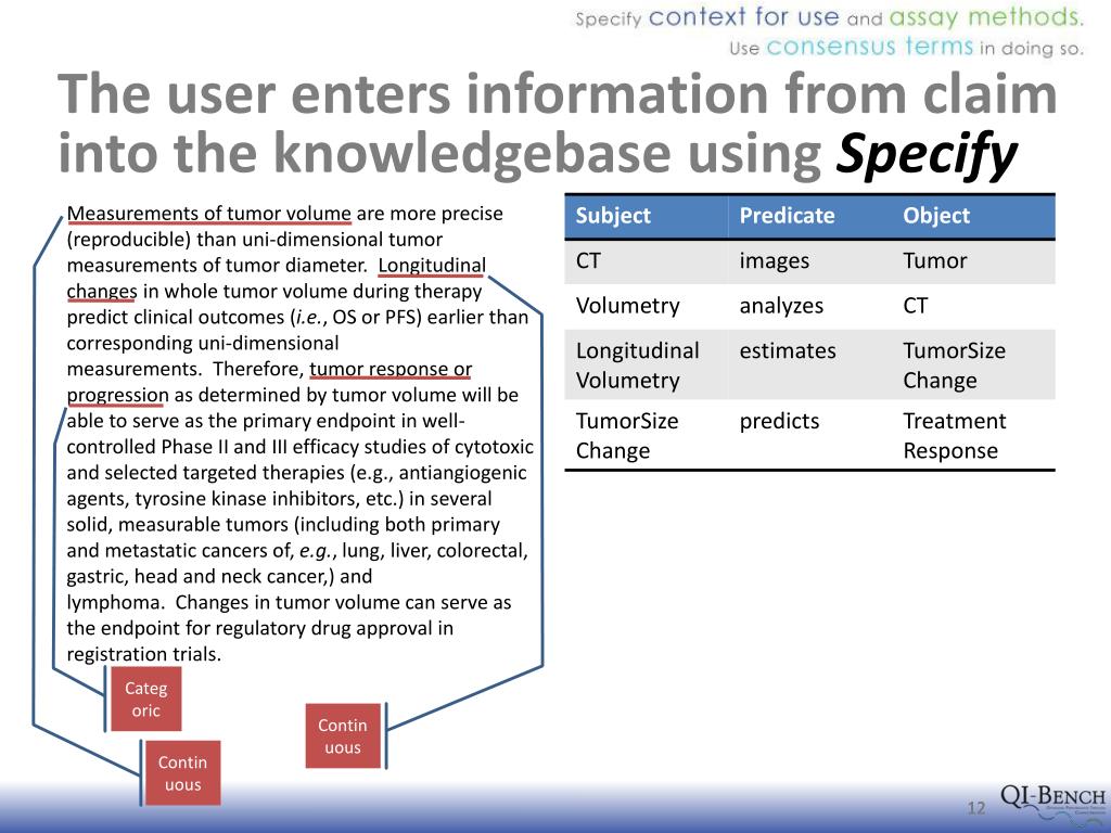 The user enters information from claiminto the knowledgebase using Specify Measurements of tumor volume are more precise (reproducible) than uni-dimensional tumor measurements of tumor diameter. Longitudinal changes in whole tumor volume during therapy predict clinical outcomes (i.e., OS or PFS) earlier than corresponding uni-dimensional measurements. Therefore, tumor response or progression as determined by tumor volume will be able to serve as the primary endpoint in well-controlled Phase II and III efficacy studies of cytotoxic and selected targeted therapies (e.g., antiangiogenic agents, tyrosine kinase inhibitors, etc.) in several solid, measurable tumors (including both primary and metastatic cancers of, e.g., lung, liver, colorectal, gastric, head and neck cancer,) and lymphoma. Changes in tumor volume can serve as the endpoint for regulatory drug approval in registration trials. Categoric Continuous Continuous 12