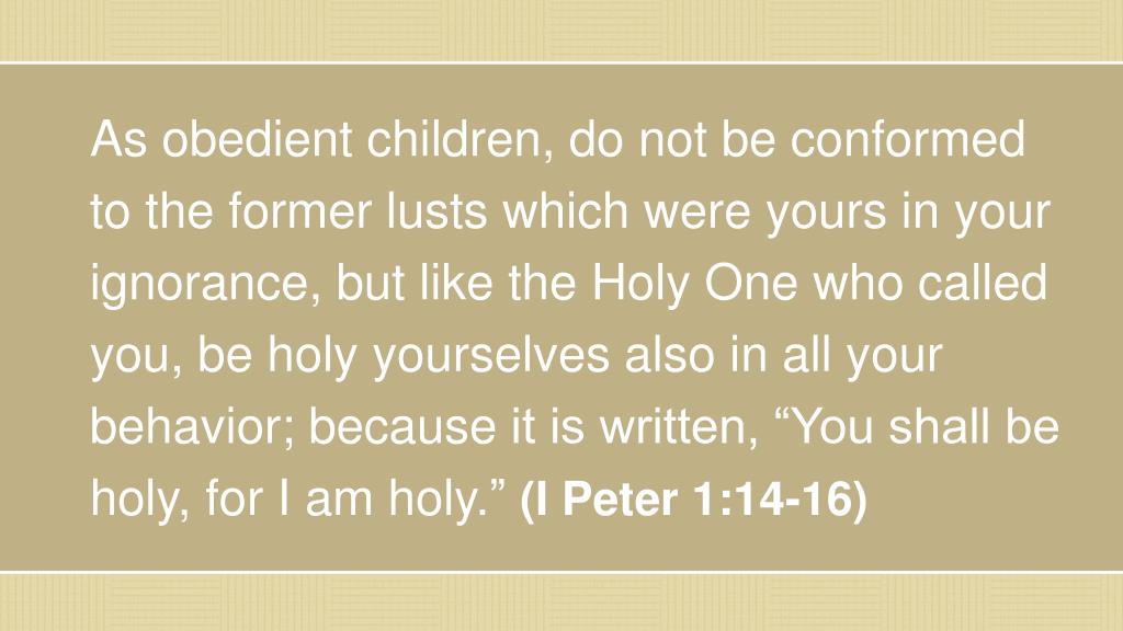 As obedient children, do not be conformed to the former lusts which were yours in your ignorance, but like the Holy One who called you, be holy yourselves also in all your behavior; because it is written, “You shall be holy, for I am holy.” (I Peter 1:14-16)