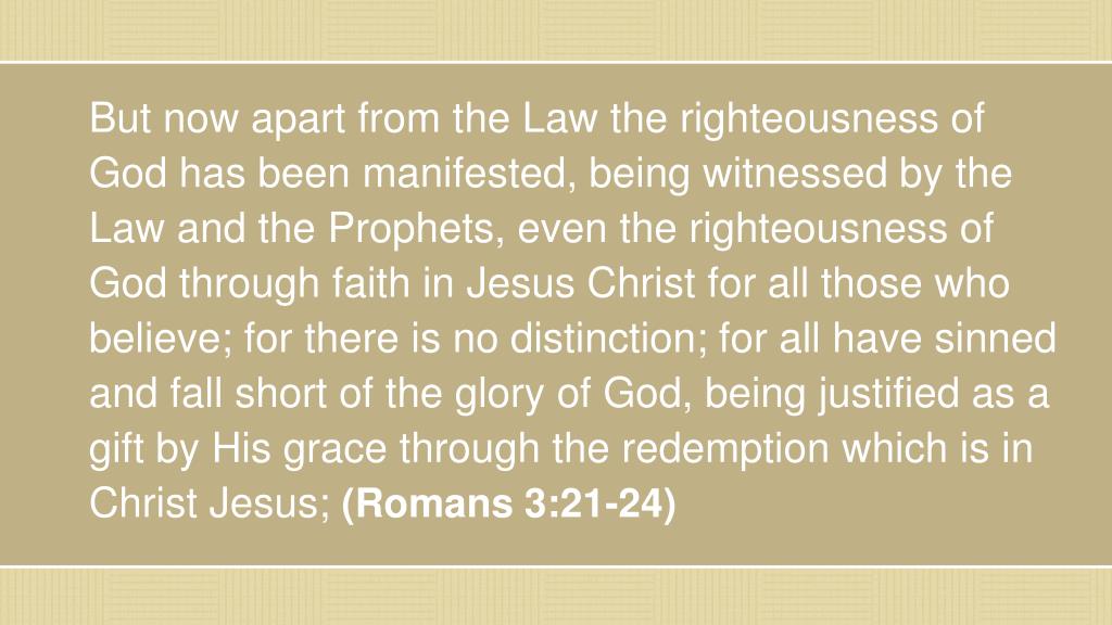 But now apart from the Law the righteousness of God has been manifested, being witnessed by the Law and the Prophets, even the righteousness of God through faith in Jesus Christ for all those who believe; for there is no distinction; for all have sinned and fall short of the glory of God, being justified as a gift by His grace through the redemption which is in Christ Jesus; (Romans 3:21-24)