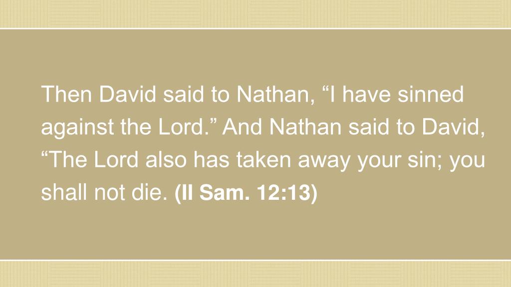 Then David said to Nathan, “I have sinned against the Lord.” And Nathan said to David, “The Lord also has taken away your sin; you shall not die. (II Sam. 12:13)