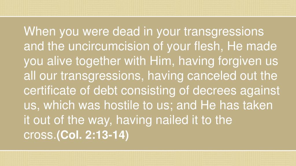 When you were dead in your transgressions and the uncircumcision of your flesh, He made you alive together with Him, having forgiven us all our transgressions, having canceled out the certificate of debt consisting of decrees against us, which was hostile to us; and He has taken it out of the way, having nailed it to the cross.(Col. 2:13-14)