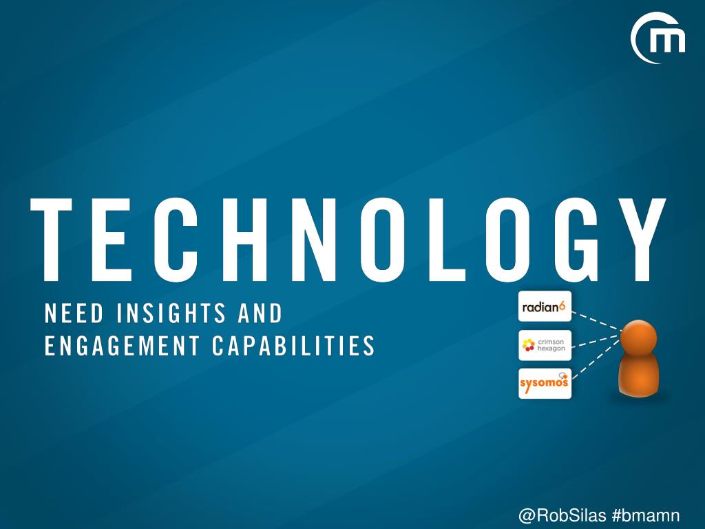 Social listening – outputs become inputs Listen for Engagement Opportunities Across the Enterprise Business Value Insights Customer Service Strategic Planning Sales Innovation Marketing • Industry • Competitors • Hot topics • Trends • Issue resolution • Product performance • Support trends • Purchase intent • Lead gen • Funnel analysis • Product Development • New opportunities • Desired features • Brand perception • Brand reach • Content strategy @RobSilas #bmamn