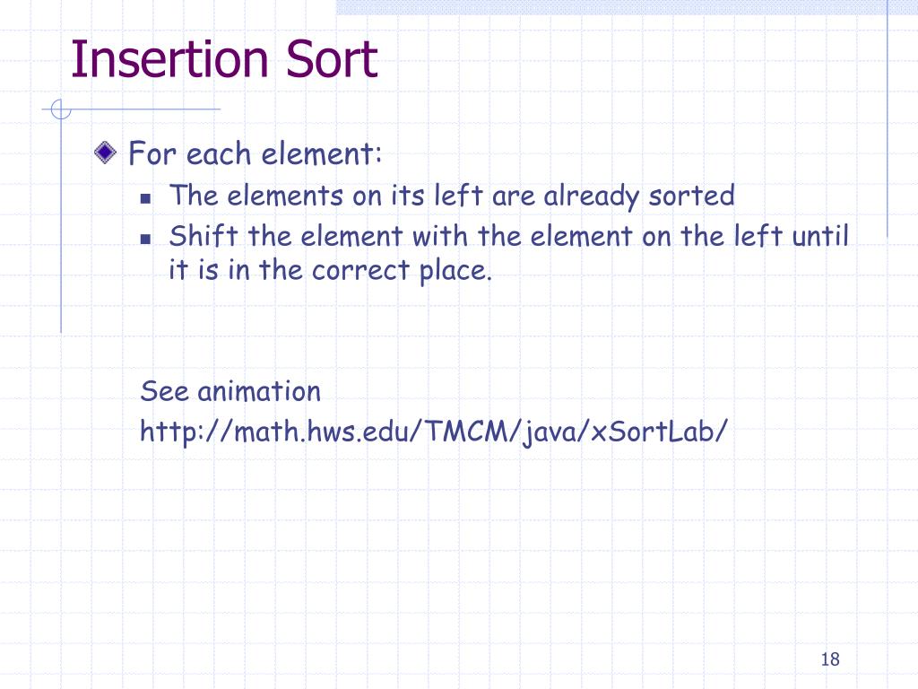 Insertion Sort • For each element: • The elements on its left are already sorted • Shift the element with the element on the left until it is in the correct place. See animation http://math.hws.edu/TMCM/java/xSortLab/