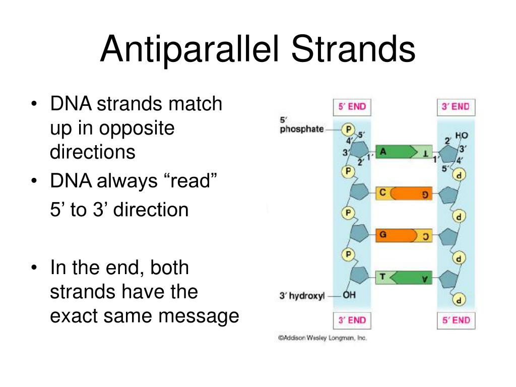DNA strands match up in opposite directions DNA always “read” 5’ to 3’ direction In the end, both strands have the exact same message Antiparallel Strands