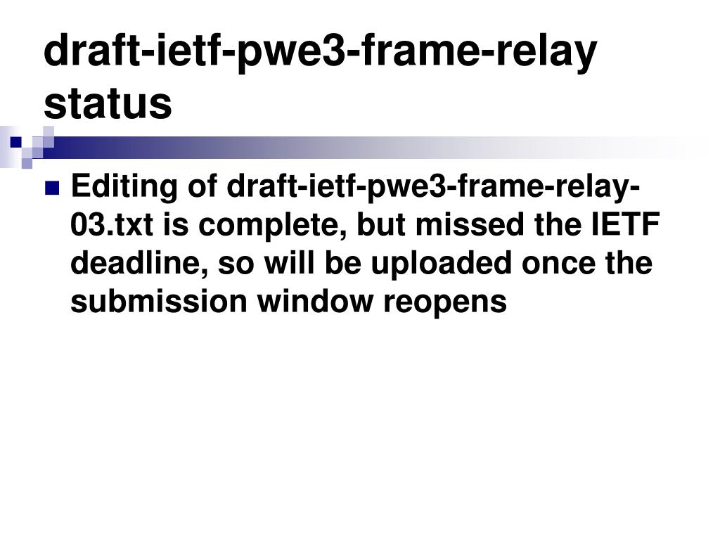 draft-ietf-pwe3-frame-relay status • Editing of draft-ietf-pwe3-frame-relay-03.txt is complete, but missed the IETF deadline, so will be uploaded once the submission window reopens
