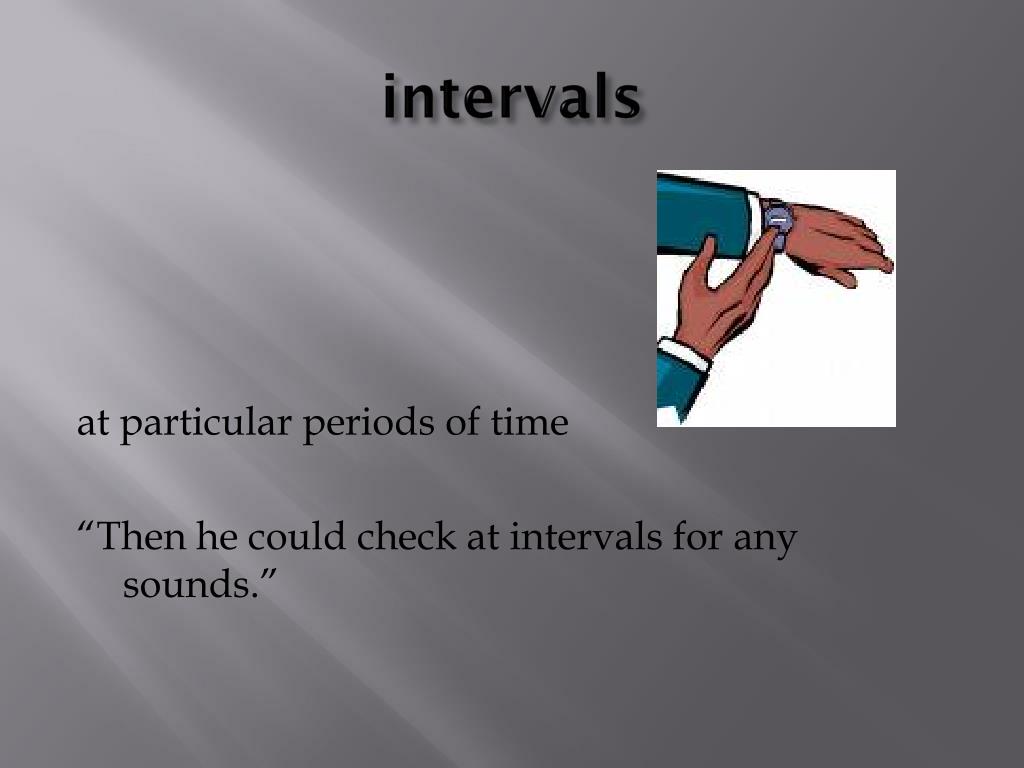 intervals at particular periods of time “Then he could check at intervals for any sounds.”