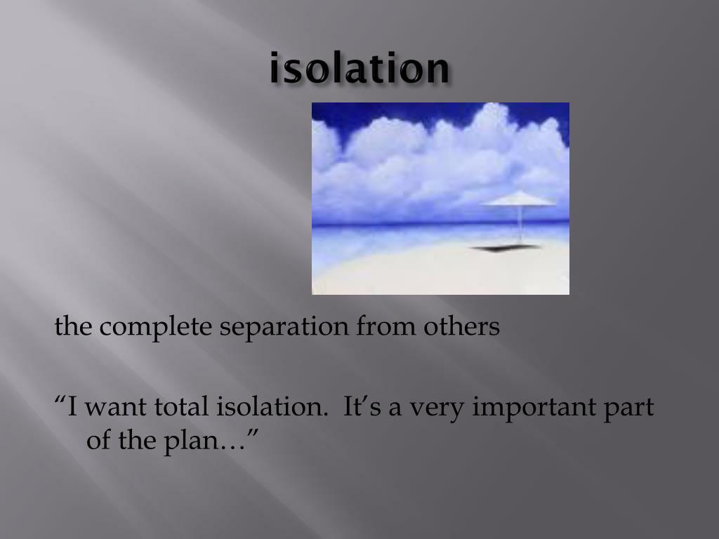 isolation the complete separation from others “I want total isolation. It’s a very important part of the plan…”
