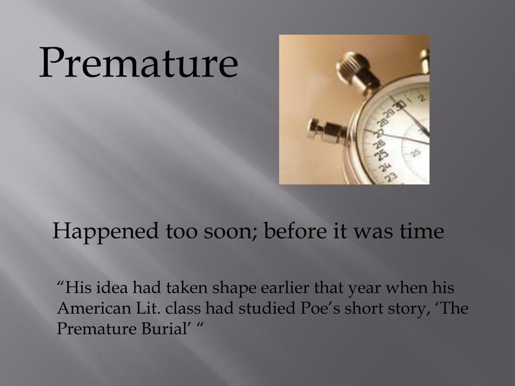 Premature Happened too soon; before it was time “His idea had taken shape earlier that year when his American Lit. class had studied Poe’s short story, ‘The Premature Burial’ “