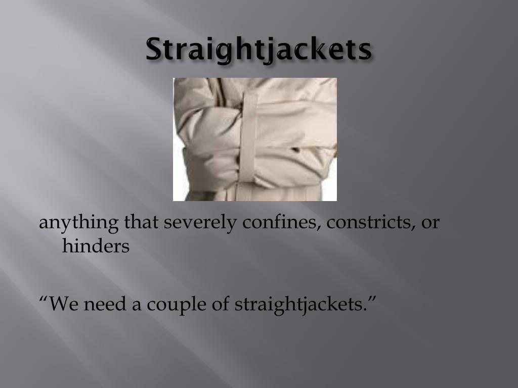 Straightjackets anything that severely confines, constricts, or hinders “We need a couple of straightjackets.”