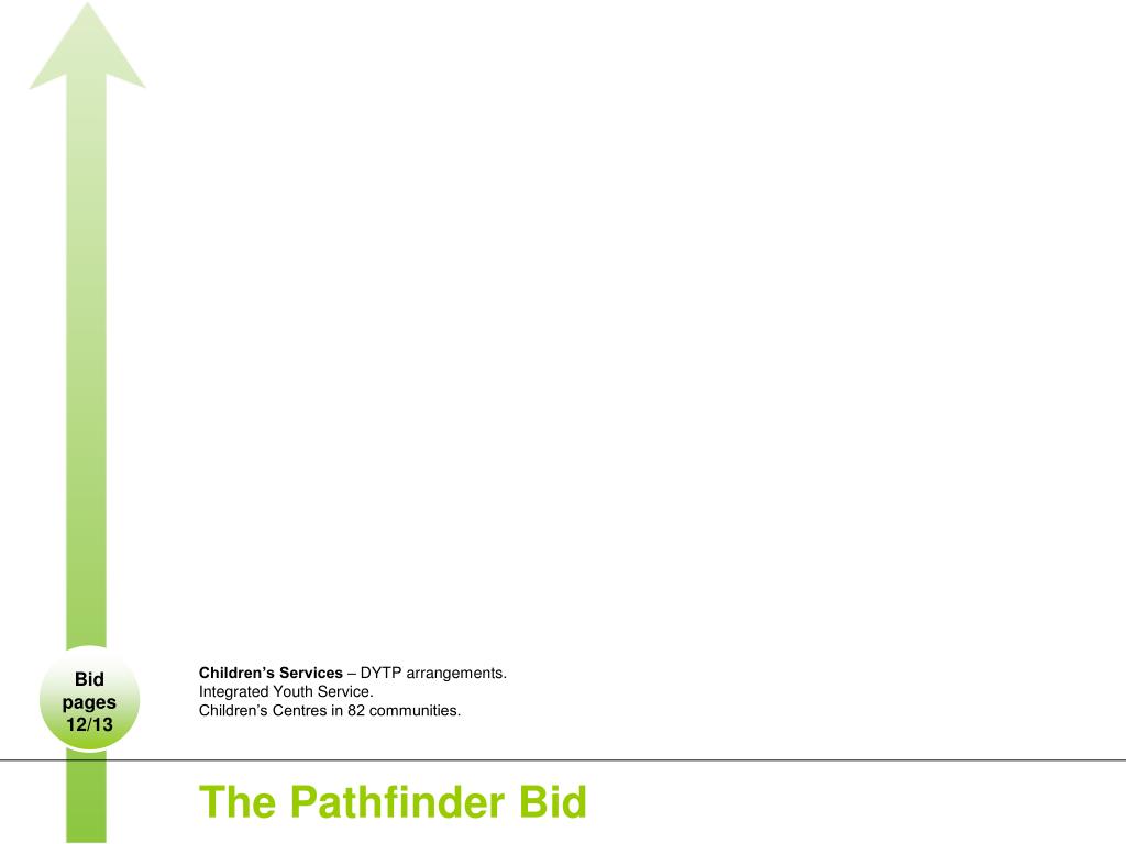 Pathfinder - 3 Key Aims. AIMS Customer focused services. Sustainable service provision. Effective and efficient local government. Children’s Services – DYTP arrangements. Integrated Youth Service. Children’s Centres in 82 communities. Bid pages 12/13. The Pathfinder Bid.