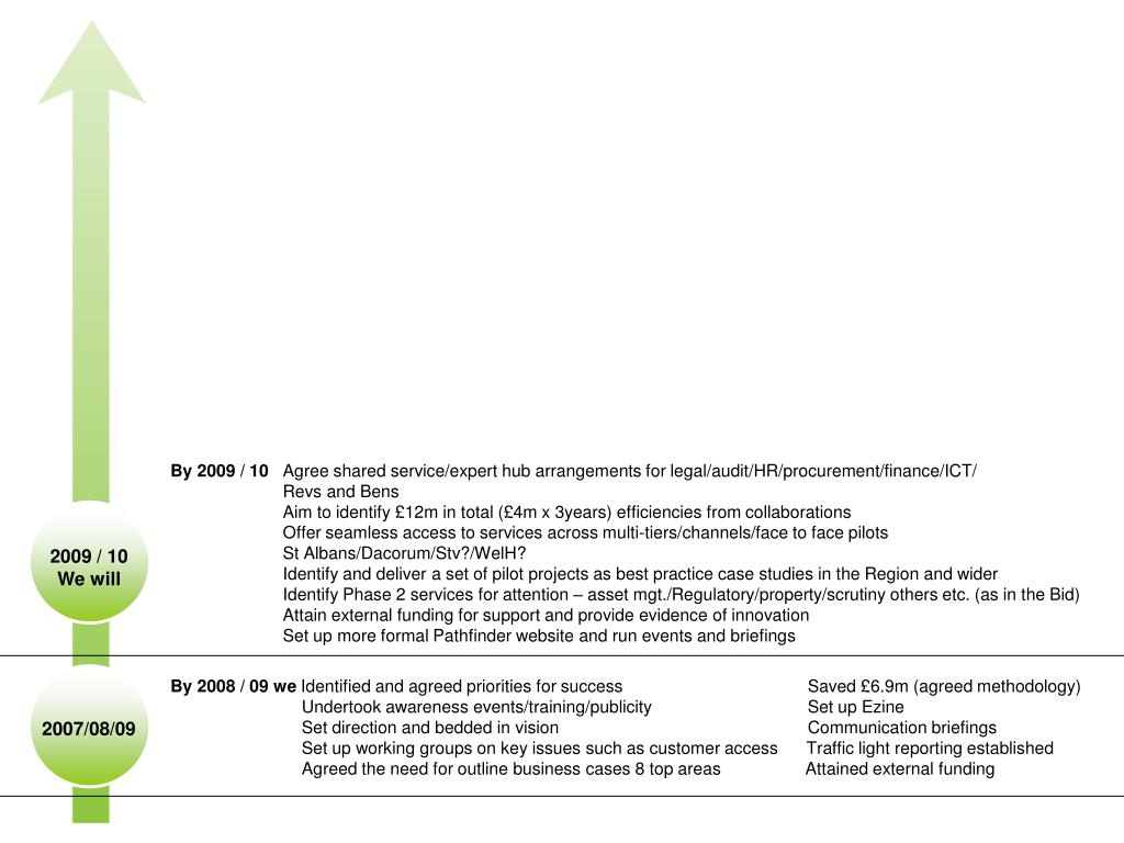 By 2009 / 10 Agree shared service/expert hub arrangements for legal/audit/HR/procurement/finance/ICT/ Revs and Bens Aim to identify £12m in total (£4m x 3years) efficiencies from collaborations Offer seamless access to services across multi-tiers/channels/face to face pilots St Albans/Dacorum/Stv?/WelH? Identify and deliver a set of pilot projects as best practice case studies in the Region and wider Identify Phase 2 services for attention – asset mgt./Regulatory/property/scrutiny others etc. (as in the Bid) Attain external funding for support and provide evidence of innovation Set up more formal Pathfinder website and run events and briefings 2009 / 10 We will By 2008 / 09 we Identified and agreed priorities for success Saved £6.9m (agreed methodology) Undertook awareness events/training/publicity Set up Ezine Set direction and bedded in vision Communication briefings Set up working groups on key issues such as customer access Traffic light reporting established Agreed the need for outline business cases 8 top areas Attained external funding 2007/08/09