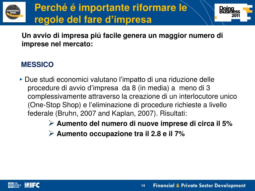 Perché é importanteriformare le regole del fare d’impresa Un avviodiimpresapiú facile genera un maggiornumerodiimpresenelmercato: MESSICO • ► Due studieconomicivalutanol’impattodiunariduzionedelle procedure diavviod’impresada 8 (in media) amenodi 3 complessivamenteattraverso la creazionedi un interlocutoreunico (One-Stop Shop) e l’eliminazionedi procedure richieste a livellofederale (Bruhn, 2007 and Kaplan, 2007). Risultati: • Aumento del numerodinuoveimpresedi circa il5% • Aumentooccupazionetrail 2.8 e il 7%