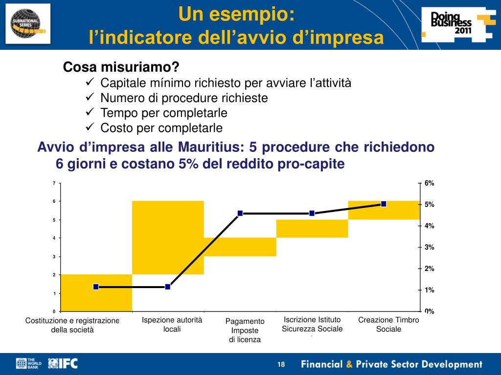 Un esempio: l’indicatoredell’avviod’impresa • Cosa misuriamo? • Capitale mínimo richiesto per avviarel’attività • Numero di procedurerichieste • Tempo per completarle • Costo per completarle • Avviod’impresaalle Mauritius: 5 procedure cherichiedono 6 giorni e costano 5% del reddito pro-capite IscrizioneIstitutoSicurezzaSociale Ispezioneautorità locali CreazioneTimbroSociale Costituzione e registrazionedellasocietà Pagamento Imposte dilicenza