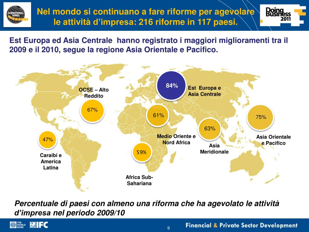 Nelmondosicontinuano a fare riforme per agevolare le attivitàd’impresa: 216 riforme in 117 paesi. EstEuropaed Asia Centralehannoregistratoimaggiorimiglioramentitrail 2009 e il 2010, segue la regione Asia Orientale e Pacifico. 84% EstEuropa e Asia Centrale OCSE – Alto Reddito 61% 47% 63% 59% 67% MedioOriente e Nord Africa 75% Asia Orientale e Pacifico Asia Meridionale Caraibi e America Latina Africa Sub-Sahariana Percentualedipaesi con almenounariformache ha agevolato le attivitàd’impresanelperiodo 2009/10 9