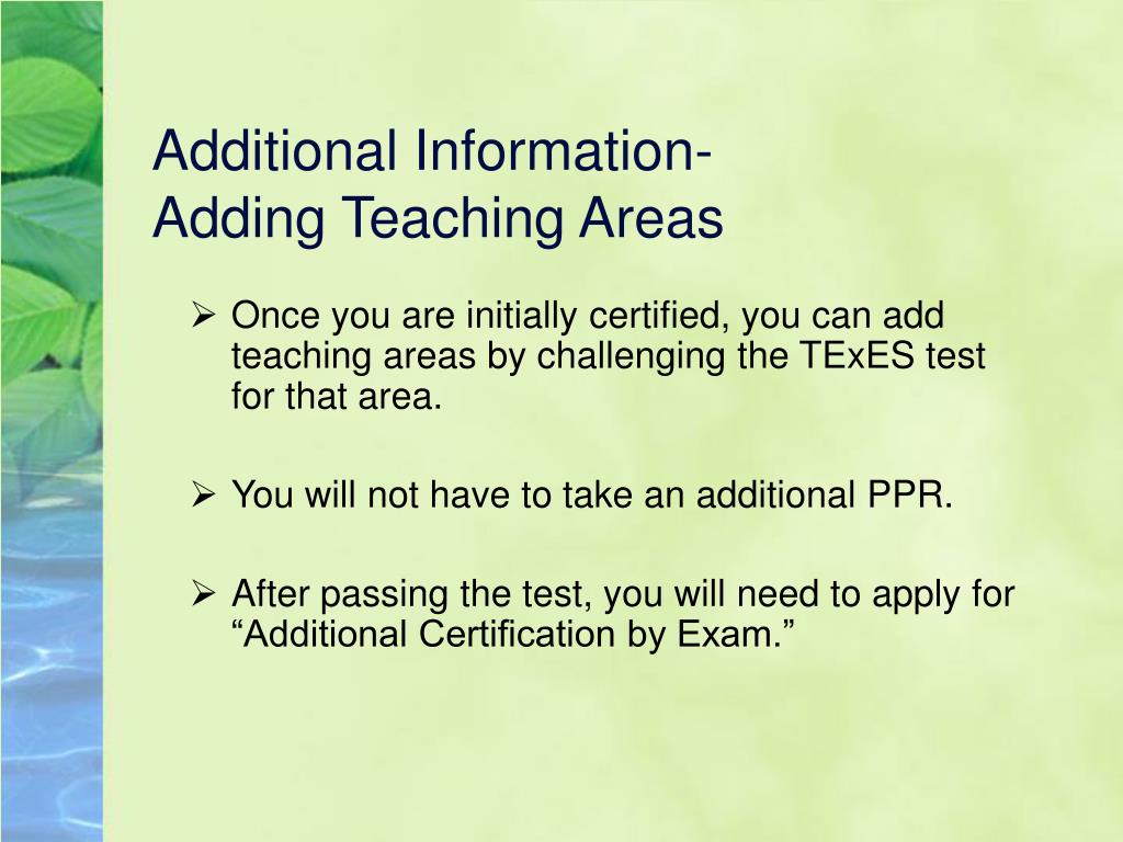 Additional Information-Adding Teaching Areas • Once you are initially certified, you can add teaching areas by challenging the TExES test for that area. • You will not have to take an additional PPR. • After passing the test, you will need to apply for “Additional Certification by Exam.”