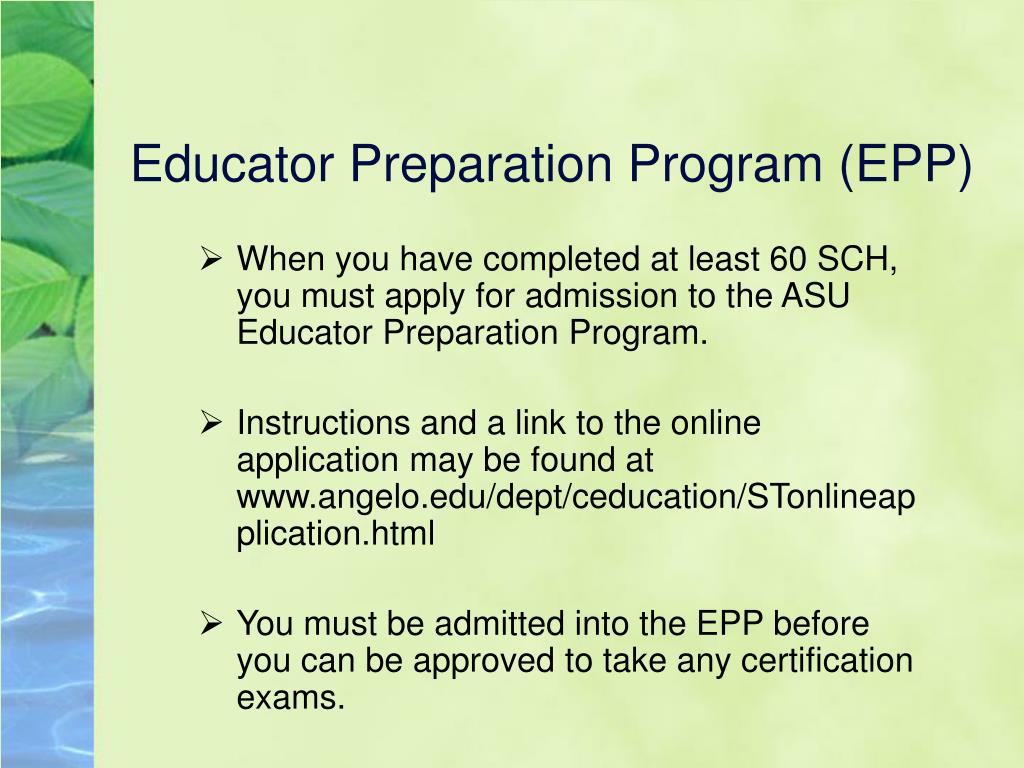 Educator Preparation Program (EPP) • When you have completed at least 60 SCH, you must apply for admission to the ASU Educator Preparation Program. • Instructions and a link to the online application may be found at www.angelo.edu/dept/ceducation/STonlineapplication.html • You must be admitted into the EPP before you can be approved to take any certification exams.
