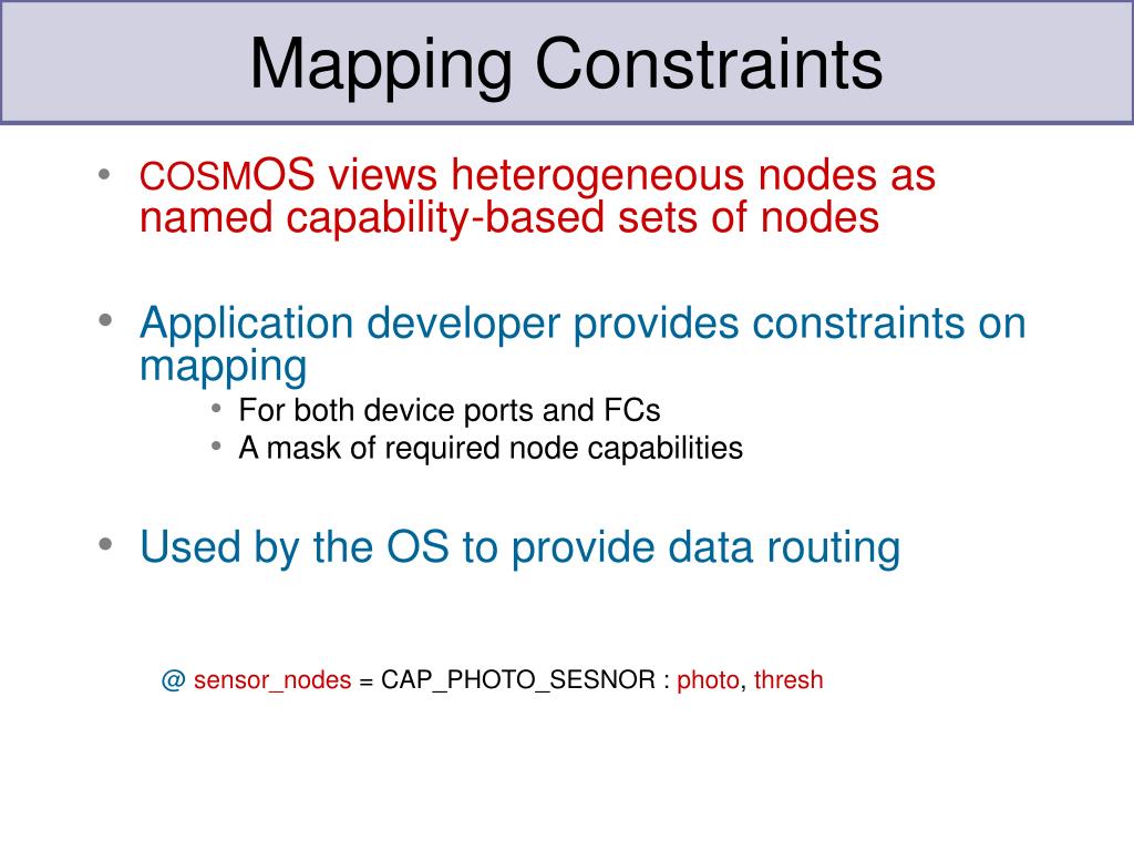 Mapping Constraints • COSMOS views heterogeneous nodes as named capability-based sets of nodes • Application developer provides constraints on mapping • For both device ports and FCs • A mask of required node capabilities • Used by the OS to provide data routing @sensor_nodes = CAP_PHOTO_SESNOR : photo, thresh