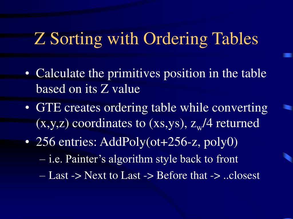 Z Sorting with Ordering Tables • Calculate the primitives position in the table based on its Z value • GTE creates ordering table while converting (x,y,z) coordinates to (xs,ys), zw/4 returned • 256 entries: AddPoly(ot+256-z, poly0) • i.e. Painter’s algorithm style back to front • Last -> Next to Last -> Before that -> ..closest
