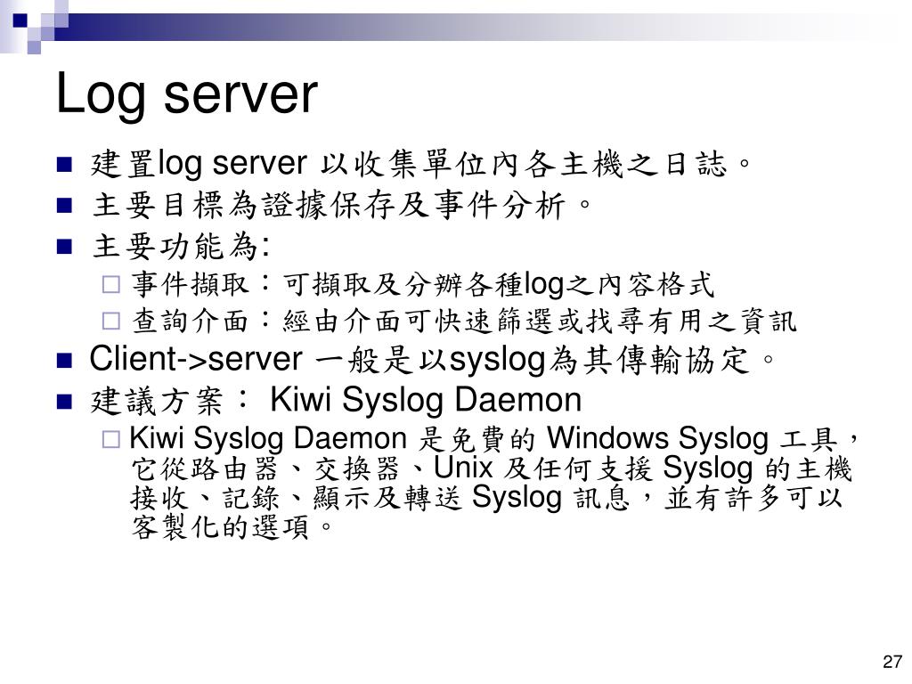 Log server • 建置log server 以收集單位內各主機之日誌。 • 主要目標為證據保存及事件分析。 • 主要功能為: • 事件擷取:可擷取及分辦各種log之內容格式 • 查詢介面:經由介面可快速篩選或找尋有用之資訊 • Client->server 一般是以syslog為其傳輸協定。 • 建議方案: Kiwi Syslog Daemon • Kiwi Syslog Daemon 是免費的 Windows Syslog 工具,它從路由器、交換器、Unix 及任何支援 Syslog 的主機接收、記錄、顯示及轉送 Syslog 訊息,並有許多可以客製化的選項。