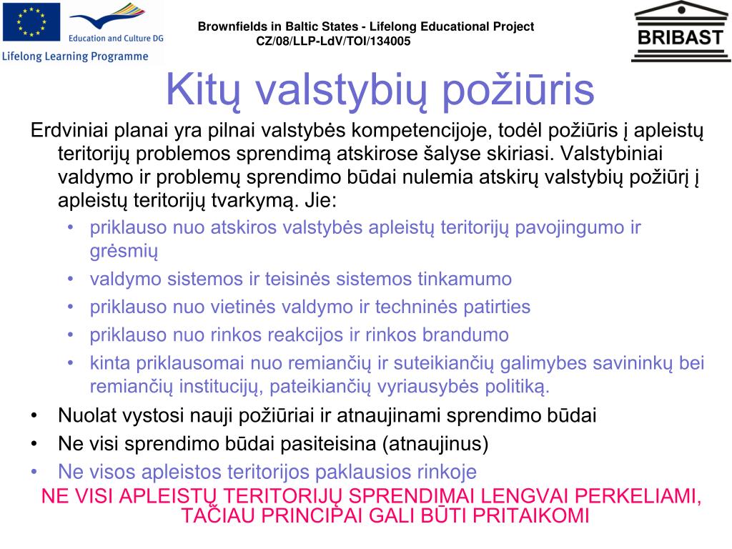 Kitų valstybių požiūris Erdviniai planai yra pilnai valstybės kompetencijoje, todėl požiūris į apleistų teritorijų problemos sprendimą atskirose šalyse skiriasi. Valstybiniai valdymo ir problemų sprendimo būdai nulemia atskirų valstybių požiūrį į apleistų teritorijų tvarkymą.Jie: • priklauso nuo atskiros valstybės apleistų teritorijų pavojingumo ir grėsmių • valdymo sistemos ir teisinės sistemos tinkamumo • priklauso nuo vietinės valdymo ir techninės patirties • priklauso nuo rinkos reakcijos ir rinkos brandumo • kinta priklausomai nuo remiančių ir suteikiančių galimybes savininkų bei remiančių institucijų, pateikiančių vyriausybės politiką. • Nuolat vystosi nauji požiūriai ir atnaujinami sprendimo būdai • Ne visi sprendimo būdai pasiteisina (atnaujinus) • Ne visos apleistos teritorijos paklausios rinkoje NE VISI APLEISTŲ TERITORIJŲ SPRENDIMAI LENGVAI PERKELIAMI, TAČIAU PRINCIPAI GALI BŪTI PRITAIKOMI