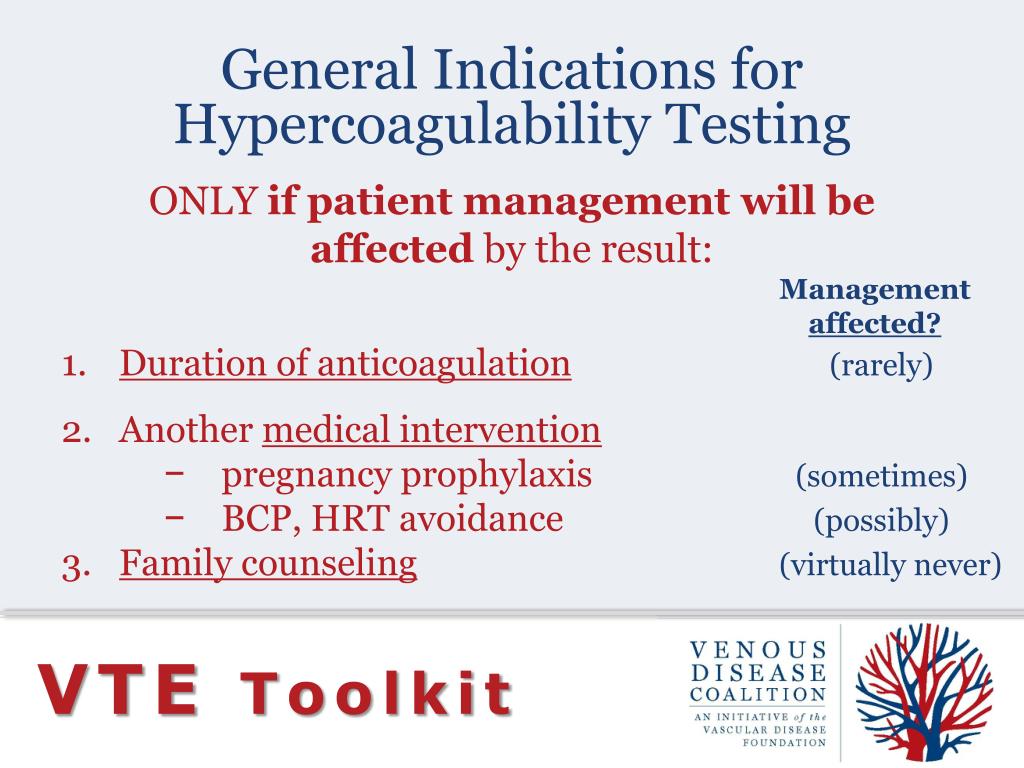 ONLY if patient management will be • affectedby the result: • Management • affected? • Duration of anticoagulation(rarely) • Another medical intervention • pregnancy prophylaxis(sometimes) • BCP, HRT avoidance(possibly) • Family counseling(virtually never) General Indications forHypercoagulability Testing VTE Toolkit