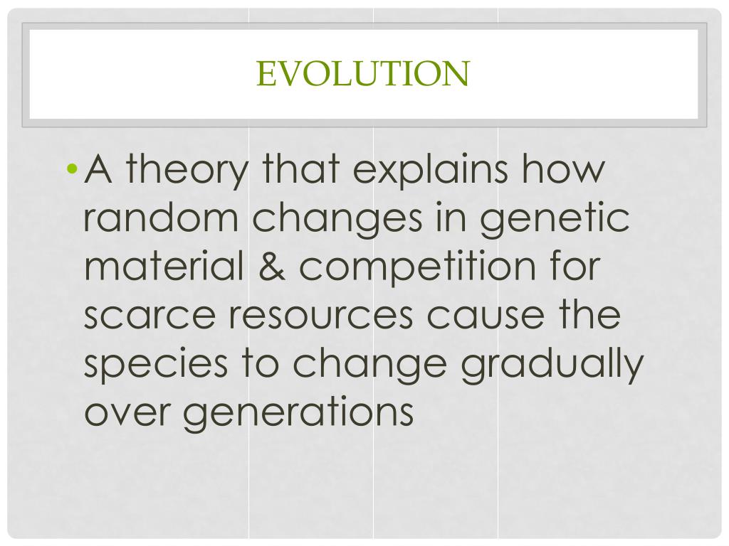 Evolution • A theory that explains how random changes in genetic material & competition for scarce resources cause the species to change gradually over generations