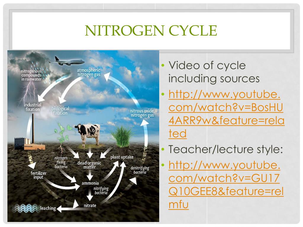 Nitrogen cycle • Video of cycle including sources • http://www.youtube.com/watch?v=BosHU4ARR9w&feature=related • Teacher/lecture style: • http://www.youtube.com/watch?v=GU17Q10GEE8&feature=relmfu
