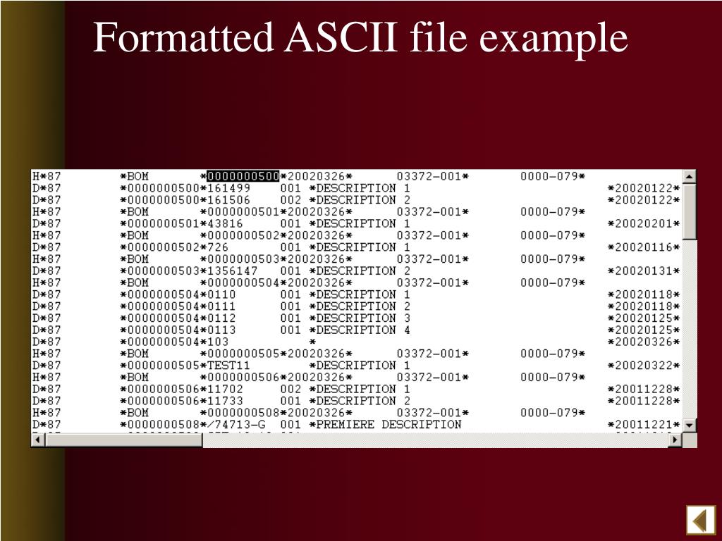 Dumping ASCII file(s) A dumping ASCII file is usually the actual printed document sent to a file with Header and multiple detail lines*. This is the most difficult file to work with. * Note : The detail may contain only 1 or many lines.