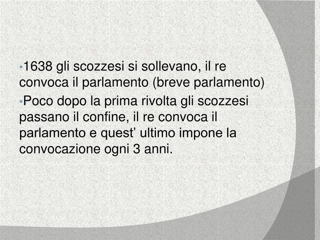 1638 gli scozzesi si sollevano, il re convoca il parlamento (breve parlamento) • Poco dopo la prima rivolta gli scozzesi passano il confine, il re convoca il parlamento e quest’ ultimo impone la convocazione ogni 3 anni.