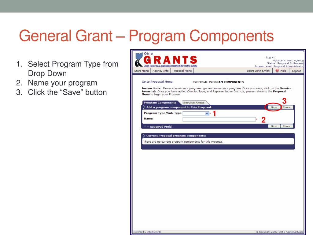 General Grant – Program Components Select Program Type from Drop Down Name your program Click the “Save” button 3 1 2