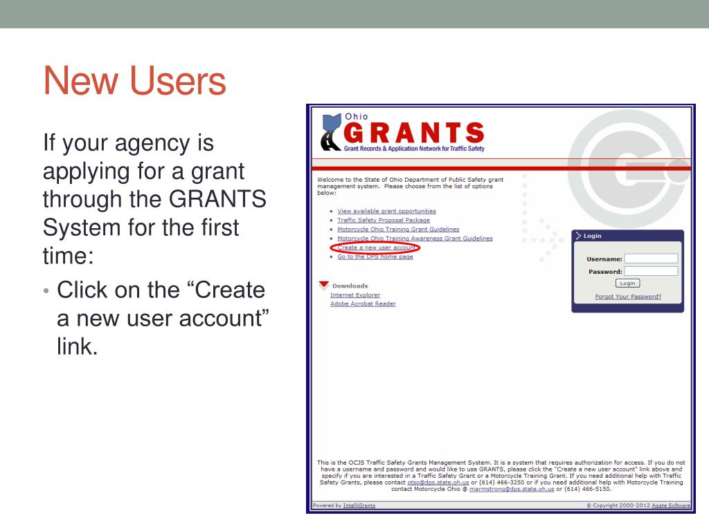 New Users If your agency is applying for a grant through the GRANTS System for the first time: • Click on the “Create a new user account” link.