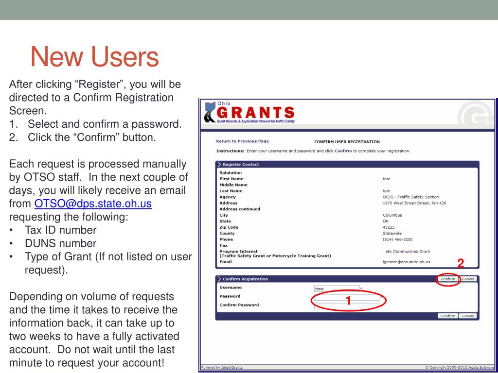 New Users • After clicking “Register”, you will be directed to a Confirm Registration Screen. • Select and confirm a password. • Click the “Confirm” button. • Each request is processed manually by OTSO staff. In the next couple of days, you will likely receive an email from OTSO@dps.state.oh.us requesting the following: • Tax ID number • DUNS number • Type of Grant (If not listed on user request). • Depending on volume of requests and the time it takes to receive the information back, it can take up to two weeks to have a fully activated account. Do not wait until the last minute to request your account! 2 1