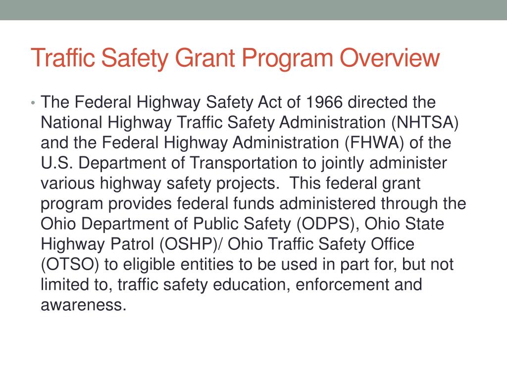 Traffic Safety Grant Program Overview • The Federal Highway Safety Act of 1966 directed the National Highway Traffic Safety Administration (NHTSA) and the Federal Highway Administration (FHWA) of the U.S. Department of Transportation to jointly administer various highway safety projects. This federal grant program provides federal funds administered through the Ohio Department of Public Safety (ODPS), Ohio State Highway Patrol (OSHP)/ Ohio Traffic Safety Office (OTSO) to eligible entities to be used in part for, but not limited to, traffic safety education, enforcement and awareness.