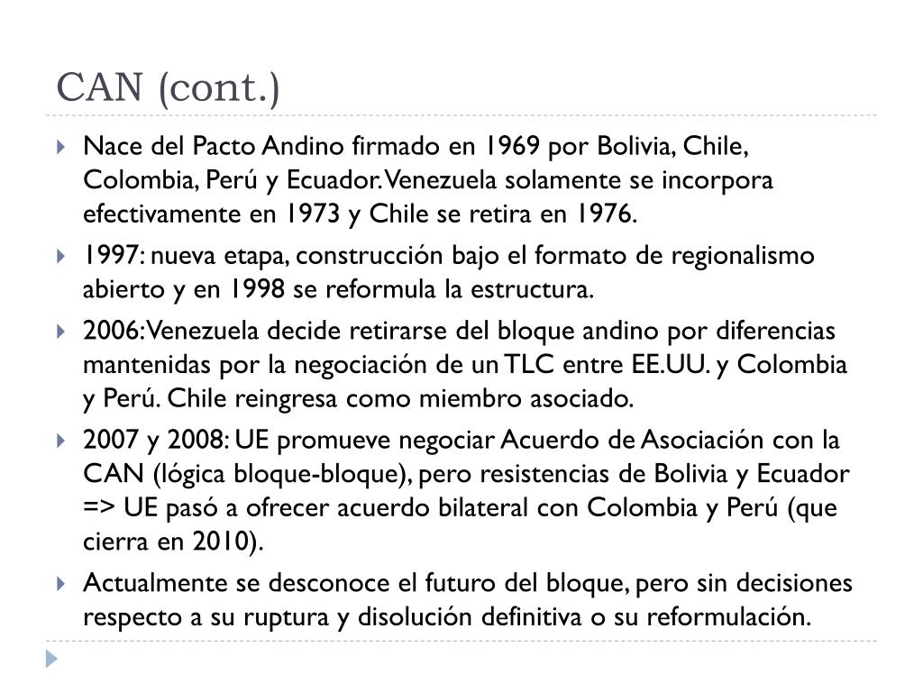 CAN (cont.) • Nace del Pacto Andino firmado en 1969 por Bolivia, Chile, Colombia, Perú y Ecuador. Venezuela solamente se incorpora efectivamente en 1973 y Chile se retira en 1976. • 1997: nueva etapa, construcción bajo el formato de regionalismo abierto y en 1998 se reformula la estructura. • 2006: Venezuela decide retirarse del bloque andino por diferencias mantenidas por la negociación de un TLC entre EE.UU. y Colombia y Perú. Chile reingresa como miembro asociado. • 2007 y 2008: UE promueve negociar Acuerdo de Asociación con la CAN (lógica bloque-bloque), pero resistencias de Bolivia y Ecuador => UE pasó a ofrecer acuerdo bilateral con Colombia y Perú (que cierra en 2010). • Actualmente se desconoce el futuro del bloque, pero sin decisiones respecto a su ruptura y disolución definitiva o su reformulación.