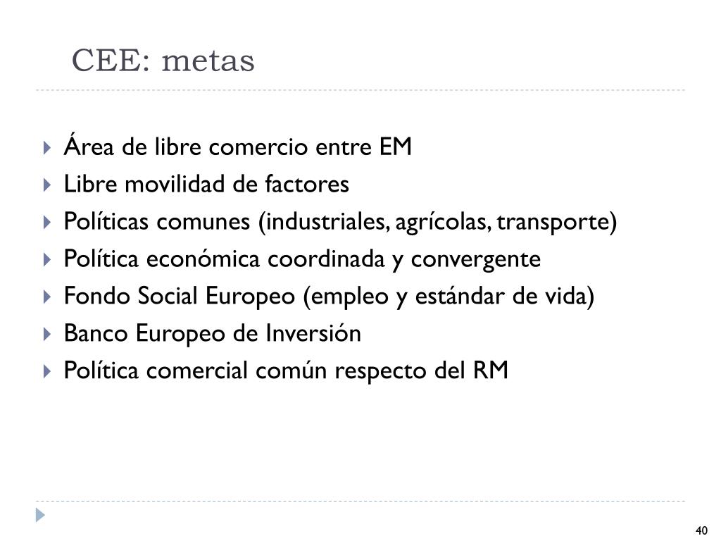 CEE: metas Área de libre comercio entre EM Libre movilidad de factores Políticas comunes (industriales, agrícolas, transporte) Política económica coordinada y convergente Fondo Social Europeo (empleo y estándar de vida) Banco Europeo de Inversión Política comercial común respecto del RM 40