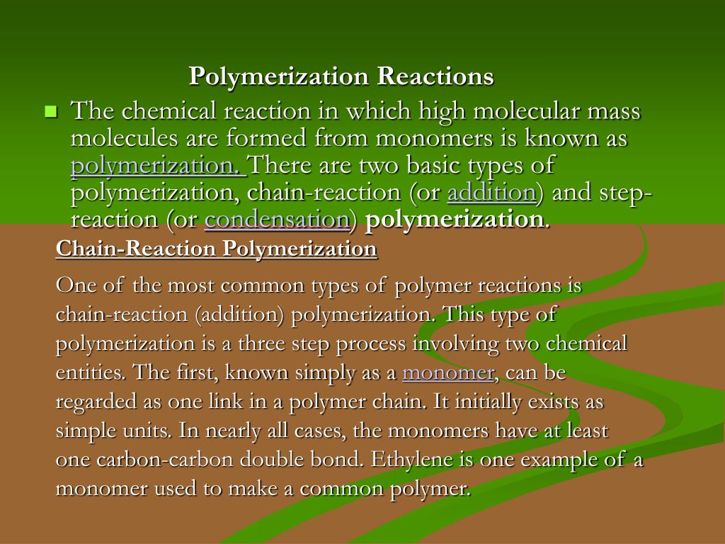 Polymerization Reactions • The chemical reaction in which high molecular mass molecules are formed from monomers is known as polymerization. There are two basic types of polymerization, chain-reaction (or addition) and step-reaction (or condensation) polymerization. Chain-Reaction Polymerization One of the most common types of polymer reactions is chain-reaction (addition) polymerization. This type of polymerization is a three step process involving two chemical entities. The first, known simply as a monomer, can be regarded as one link in a polymer chain. It initially exists as simple units. In nearly all cases, the monomers have at least one carbon-carbon double bond. Ethylene is one example of a monomer used to make a common polymer.