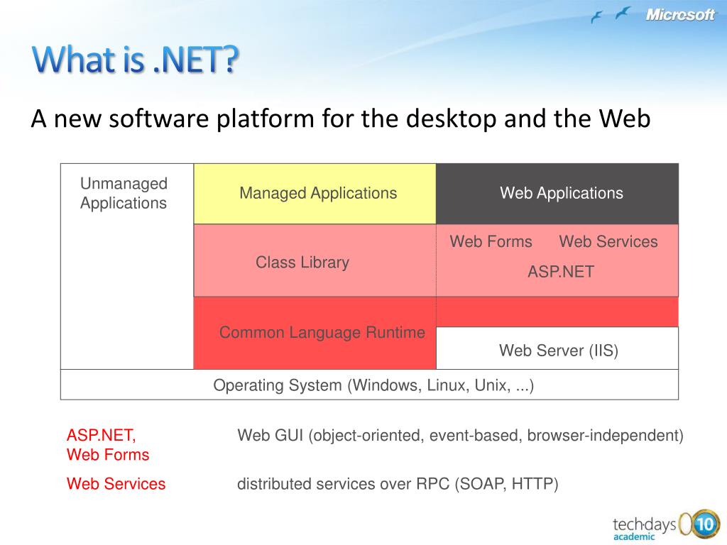 A new software platform for the desktop and the Web What is .NET? Unmanaged Applications Operating System (Windows, Linux, Unix, ...)