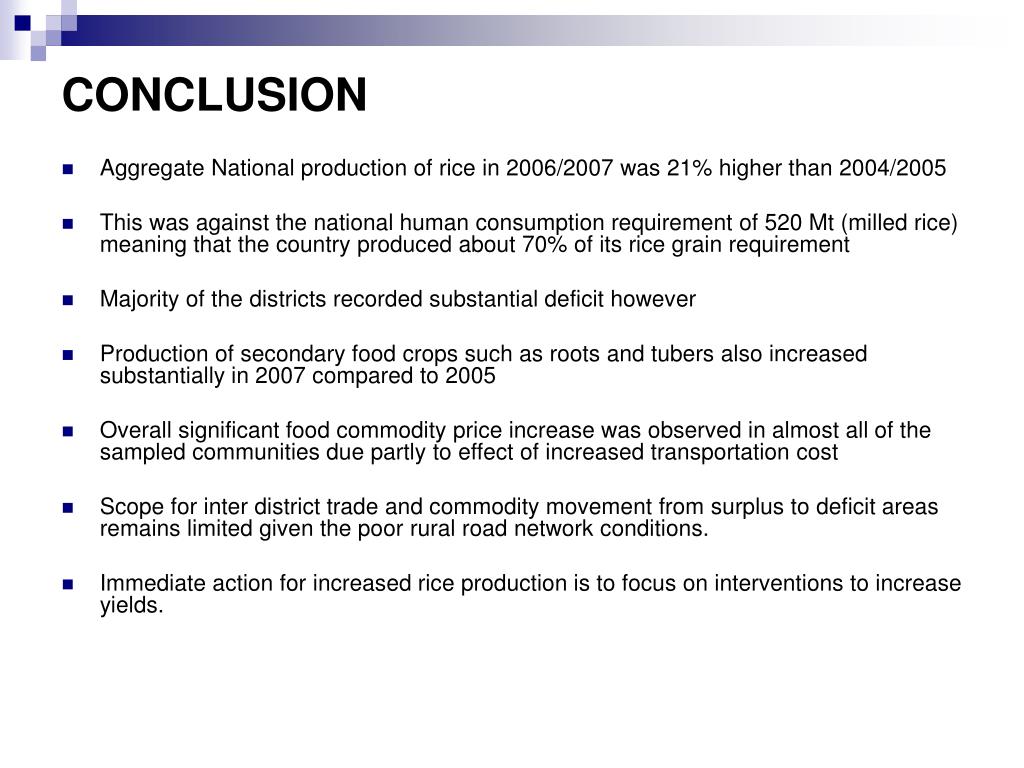 CONCLUSION • Aggregate National production of rice in 2006/2007 was 21% higher than 2004/2005 • This was against the national human consumption requirement of 520 Mt (milled rice) meaning that the country produced about 70% of its rice grain requirement • Majority of the districts recorded substantial deficit however • Production of secondary food crops such as roots and tubers also increased substantially in 2007 compared to 2005 • Overall significant food commodity price increase was observed in almost all of the sampled communities due partly to effect of increased transportation cost • Scope for inter district trade and commodity movement from surplus to deficit areas remains limited given the poor rural road network conditions. • Immediate action for increased rice production is to focus on interventions to increase yields.