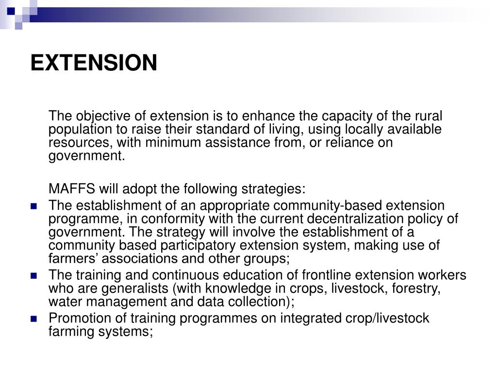 EXTENSION The objective of extension is to enhance the capacity of the rural population to raise their standard of living, using locally available resources, with minimum assistance from, or reliance on government. MAFFS will adopt the following strategies: • The establishment of an appropriate community-based extension programme, in conformity with the current decentralization policy of government. The strategy will involve the establishment of a community based participatory extension system, making use of farmers’ associations and other groups; • The training and continuous education of frontline extension workers who are generalists (with knowledge in crops, livestock, forestry, water management and data collection); • Promotion of training programmes on integrated crop/livestock farming systems;