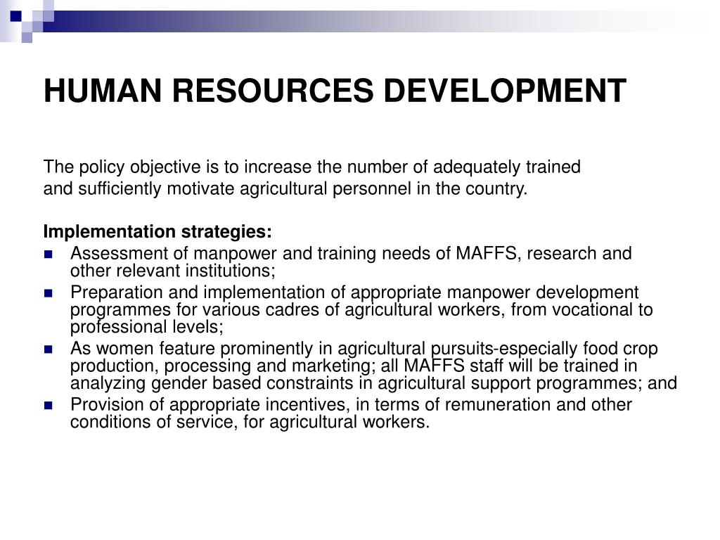 HUMAN RESOURCES DEVELOPMENT The policy objective is to increase the number of adequately trained and sufficiently motivate agricultural personnel in the country. Implementation strategies: • Assessment of manpower and training needs of MAFFS, research and other relevant institutions; • Preparation and implementation of appropriate manpower development programmes for various cadres of agricultural workers, from vocational to professional levels; • As women feature prominently in agricultural pursuits-especially food crop production, processing and marketing; all MAFFS staff will be trained in analyzing gender based constraints in agricultural support programmes; and • Provision of appropriate incentives, in terms of remuneration and other conditions of service, for agricultural workers.