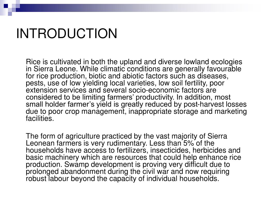INTRODUCTION Rice is cultivated in both the upland and diverse lowland ecologies in Sierra Leone. While climatic conditions are generally favourable for rice production, biotic and abiotic factors such as diseases, pests, use of low yielding local varieties, low soil fertility, poor extension services and several socio-economic factors are considered to be limiting farmers’ productivity. In addition, most small holder farmer’s yield is greatly reduced by post-harvest losses due to poor crop management, inappropriate storage and marketing facilities. The form of agriculture practiced by the vast majority of Sierra Leonean farmers is very rudimentary. Less than 5% of the households have access to fertilizers, insecticides, herbicides and basic machinery which are resources that could help enhance rice production. Swamp development is proving very difficult due to prolonged abandonment during the civil war and now requiring robust labour beyond the capacity of individual households.