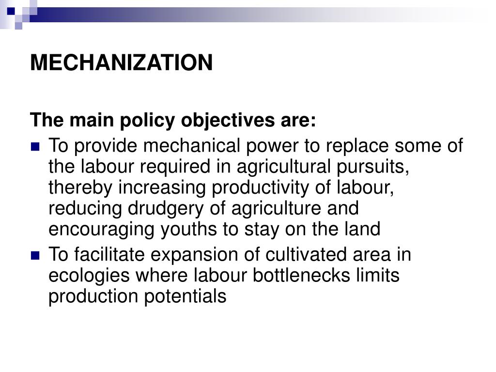 MECHANIZATION The main policy objectives are: • To provide mechanical power to replace some of the labour required in agricultural pursuits, thereby increasing productivity of labour, reducing drudgery of agriculture and encouraging youths to stay on the land • To facilitate expansion of cultivated area in ecologies where labour bottlenecks limits production potentials