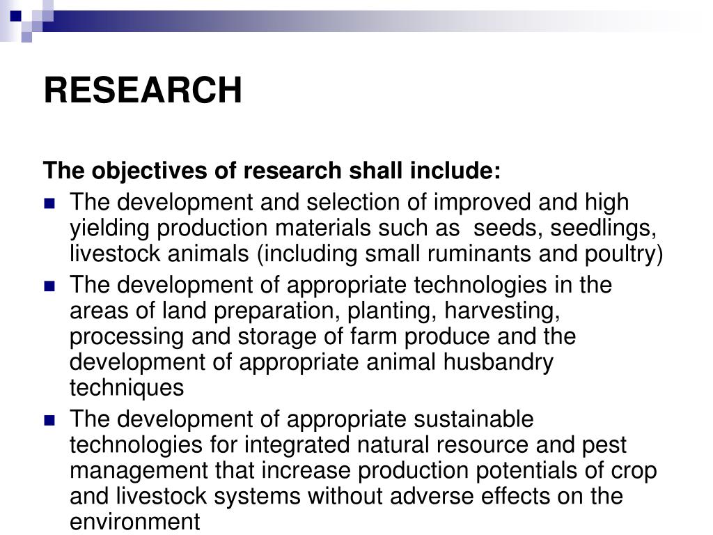 RESEARCH The objectives of research shall include: • The development and selection of improved and high yielding production materials such as seeds, seedlings, livestock animals (including small ruminants and poultry) • The development of appropriate technologies in the areas of land preparation, planting, harvesting, processing and storage of farm produce and the development of appropriate animal husbandry techniques • The development of appropriate sustainable technologies for integrated natural resource and pest management that increase production potentials of crop and livestock systems without adverse effects on the environment