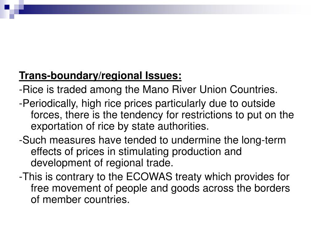 Trans-boundary/regional Issues: -Rice is traded among the Mano River Union Countries. -Periodically, high rice prices particularly due to outside forces, there is the tendency for restrictions to put on the exportation of rice by state authorities. -Such measures have tended to undermine the long-term effects of prices in stimulating production and development of regional trade. -This is contrary to the ECOWAS treaty which provides for free movement of people and goods across the borders of member countries.