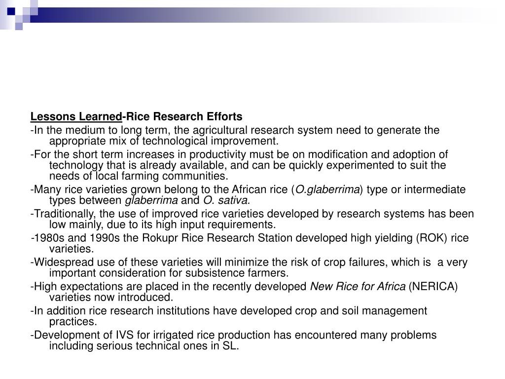 Lessons Learned-Rice Research Efforts -In the medium to long term, the agricultural research system need to generate the appropriate mix of technological improvement. -For the short term increases in productivity must be on modification and adoption of technology that is already available, and can be quickly experimented to suit the needs of local farming communities. -Many rice varieties grown belong to the African rice (O.glaberrima) type or intermediate types between glaberrima and O. sativa. -Traditionally, the use of improved rice varieties developed by research systems has been low mainly, due to its high input requirements. -1980s and 1990s the Rokupr Rice Research Station developed high yielding (ROK) rice varieties. -Widespread use of these varieties will minimize the risk of crop failures, which is a very important consideration for subsistence farmers. -High expectations are placed in the recently developed New Rice for Africa (NERICA) varieties now introduced. -In addition rice research institutions have developed crop and soil management practices. -Development of IVS for irrigated rice production has encountered many problems including serious technical ones in SL.